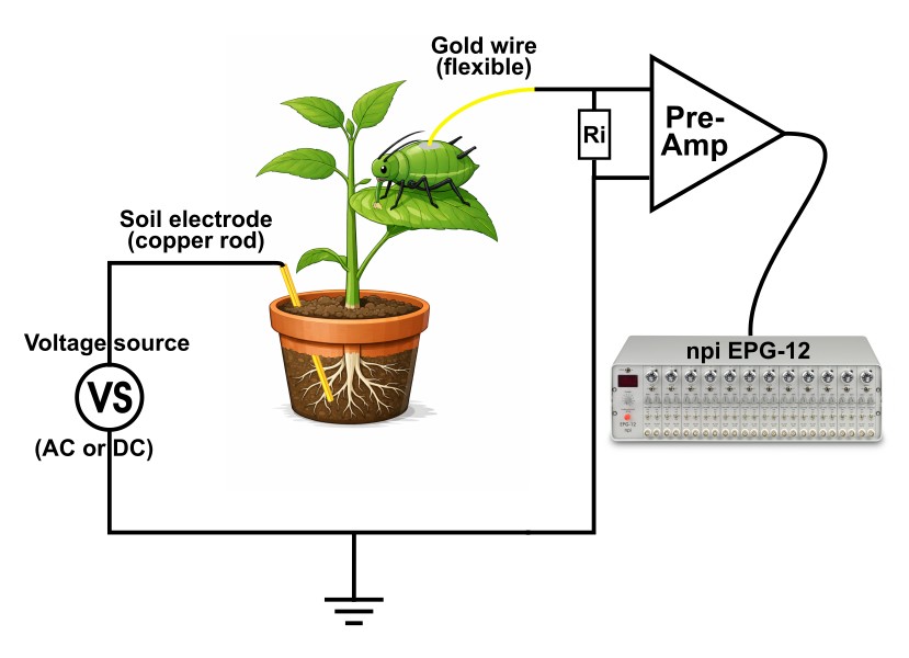 A voltage source (AC or DC) is connected to a soil electrode near the plant’s roots. A flexible gold wire is glued to the insect and connected to a preamplifying headstage. When an insect feeds on a plant, it completes a tiny electrical circuit. Changes inside the plant and insect generate measurable electrical signals:
