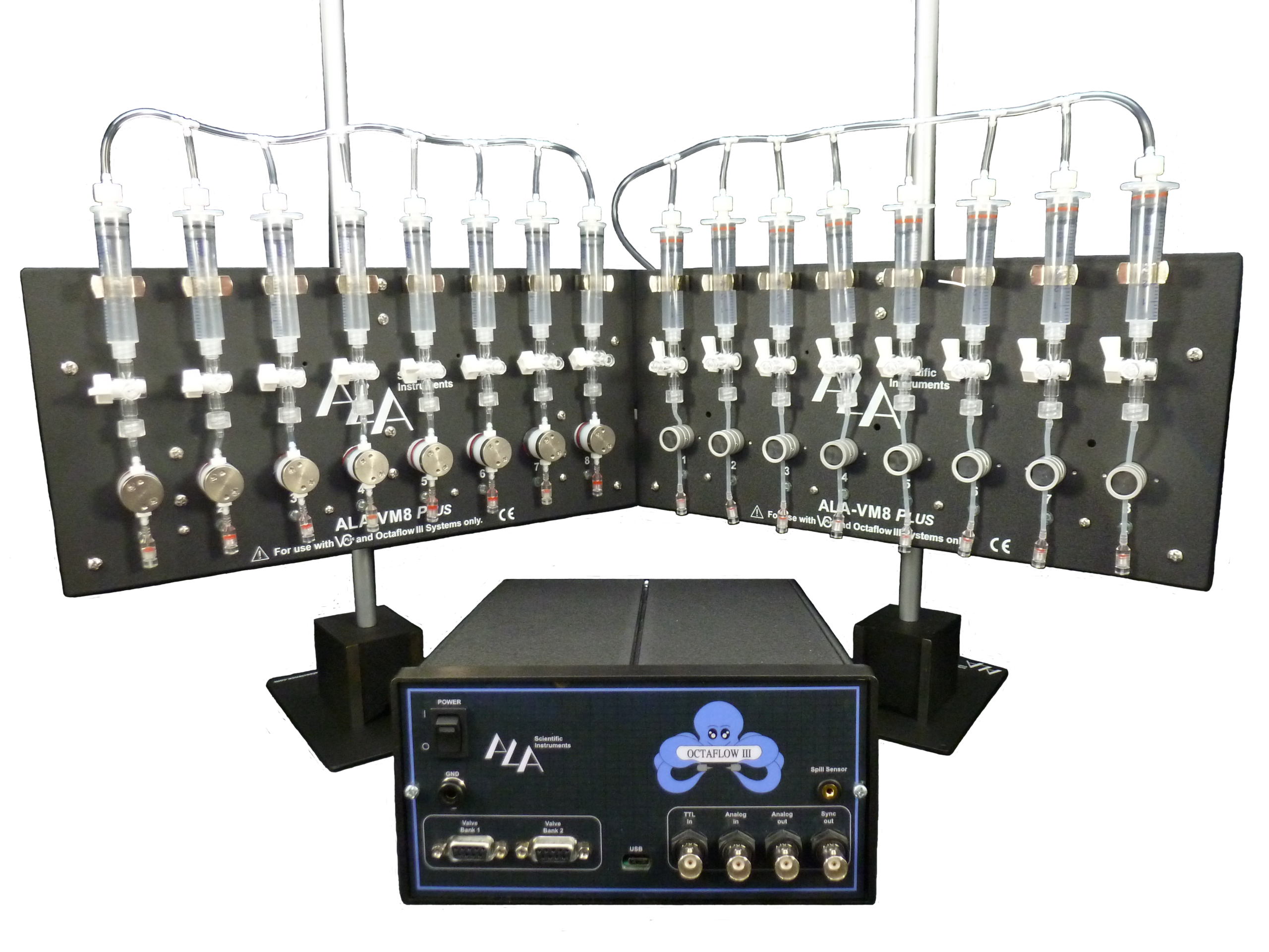 - Valve manifold(s) with islotation or pinch valves and 5ml pressurized syringe reservoirs